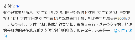 中国证券网讯(记者 严洲)支付宝官方微博今日表示,支付宝手机支付用户已经超过1亿,支付宝钱包用户数也接近1亿。支付宝日常支付约有1/3的笔数来自手机,相比去年的增长在800%以上。该官方微博称,从今天起,支付宝钱包将成为独立品牌。