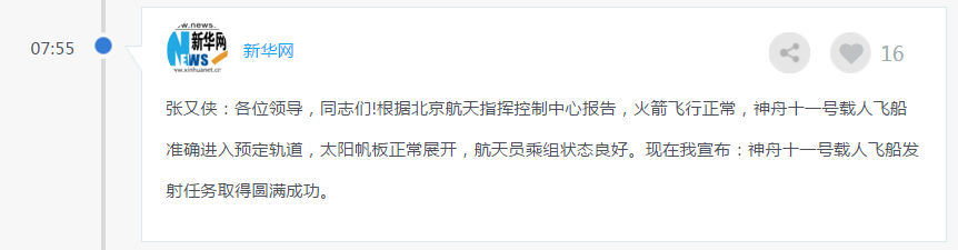 07:55 中国载人航天工程总指挥张又侠宣布:神舟十一号载人飞船发射任务取得圆满成功。