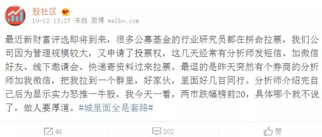 投票的时候大机构看脸熟、看服务、看拉票,小机构看看这个人是不是耳熟能详也就投了。于是小机构和个人一窝蜂开始学习网红路线,股票红人、辣妹基金经理在各大直播平台上大胆的大盘评述、个股分析也开始了。