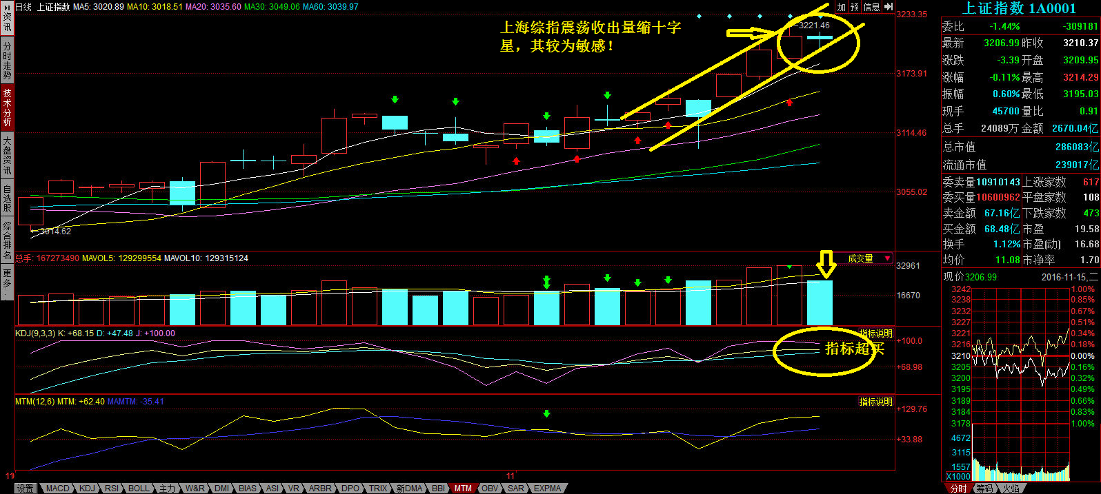 技术指标显示,目前上证综指与深圳成指的日K线指标中的KDJ、WR%、RSI等均处于超买区域,而创业板指数补涨后,目前其同类指标也处于高位区域。15日上海综指十字星缩量K线组合,而深圳小阳减量,说明三大股指的技术偏差正在收敛,而考虑到量能指标的非持续性质,加之下方上海综指留有两个明显的缺口,因此市场一旦量能不足,应防止技术回落的下跌风险出现。量能指标MTM短期出现配合后,又再次不济,因此观察此指标的变化也较为关键。