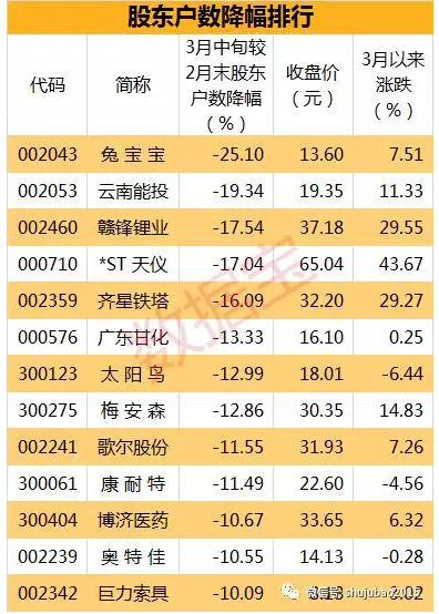 数据宝梳理发现,290家公司通过交易所互动平台公布了3月中旬股东户数,其中,161只股票股东户数较2月末出现不同程度的下降,占比过半。值得关注的是,剔除去年下半年以来上市新股,13只股票股东户数降幅超过10%。