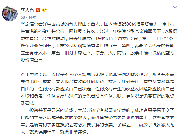 英大证券首席经济学家李大霄21日在微博表示,坚定信心看好中国市场的五大理由:首先,国内险资2500亿增量资金大举南下,将中国香港的外资空头仓位一网打尽;其次,经过一年多债券型基金独霸天下,A股权益类基金已经悄然萌动,由去年底发行1只回升到2月发行5只;第三,中国经济企稳企业业绩回升,上市公司利润增速有望止跌回升;第四;养老金为代表的长期基金有序入市;第五,相对于房地产、债券、大宗商品,股票市场中低估的蓝筹股价值凸显。