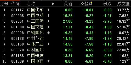 中国证券网讯 午后,中字头股票表现萎靡,截至发稿,中国化学跌停,中国中期跌9.27%,中工国际跌9.23%,中国交建、中钢国际等跌逾8%。