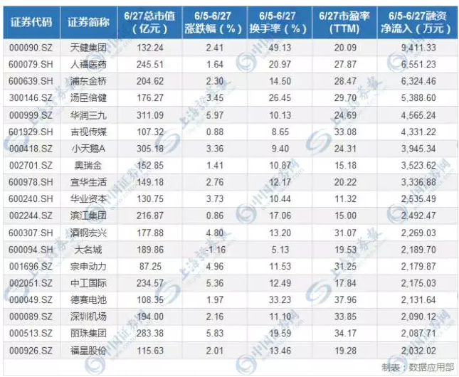 如果我们对6月5日到6月27日融资净流入个股进行进一步的观察,发现期间涨幅低于中证500涨幅(5.90%)、市盈率低于40倍、融资净流入额大于2000万元的中证500成分股有19只(见下表),我们认为这些个股后市或许仍有所作为。