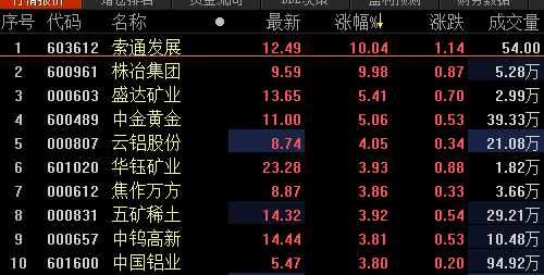 中国证券网讯 19日早盘,有色金属板块走强,截至发稿,株冶集团、索通发展涨停,盛达矿业、中金黄金涨逾5%,云铝股份涨4.05%。