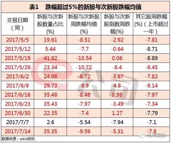 自2017年3月27日次新股指数创出阶段性高点后,板块指数便一路下滑,炒作明显降温。统计5月份以来的“闪崩”股发现(为方便分析,以周跌幅超过5%的股票为研究对象,表1),每周次新股“闪崩”股数量占总“闪崩”股的比例都超过20%,占所有次新股总数的80%以上。与上市时间超过一年的股票对比,次新股跌幅均值也大多比前者要高。