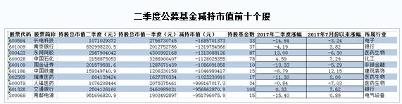 减持方面,金牛理财网数据显示,二季度被基金公司减持市值最多的10只股票中,长电科技成为季度内公募基金减持第一大股,减持市值高达16.86亿元,该股二季度跌幅达14.84%,7月份以来继续下跌3.24%。此外,医药生物行业有3只个股进入减持市值前十名榜单,分别是东阿阿胶、瑞康医药、人福医药。