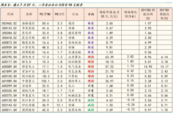 从目前披露的情况来看,证金公司持有的19支股票分别为:海格通信、华策影视、苏交科、昆仑万维、梅花生物、江苏有线、招商轮船、国电电力、雅戈尔、特变电工、紫金矿业、同方股份、中国重工、安迪苏、国机汽车、华菱星马、浙江东方、印纪传媒、国药股份。其中新进十大股东的7家公司中,传媒行业有3家(华策影视、昆仑万维和 江苏有线),通信、建筑、交运和农业行业各有1家,分别为海格通信、苏交科、招商轮船、梅花生物。