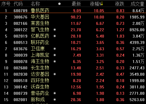 中国证券网讯 7日早盘,医药股表现抢眼,截至发稿,鲁抗医药、华大基因涨停,莱茵生物、智飞生物涨逾6%,亿帆医药、联环药业、卫信康、上海凯宝等个股均有不错表现。
