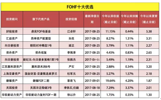 榜单主要按照2017年以来各大FOF产品的收益、回撤、以及夏普比例3项指标进行等权重考核最终获得。入选机构以代表性产品为主作为展示(不同策略可多只入选)。