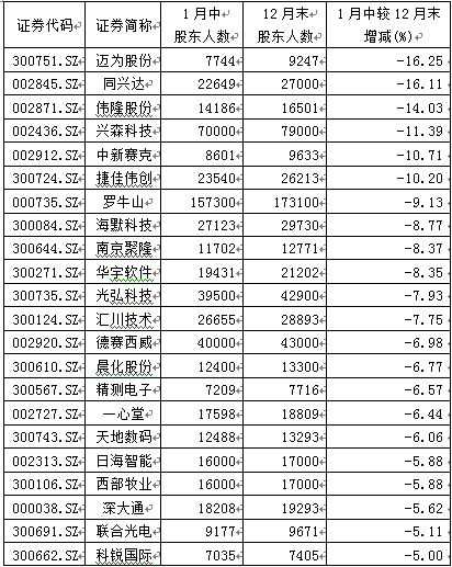 两市投资者互动平台最新披露的数据显示,在可比的244只个股中,1月中股东人数较去年12月末出现不同程度下降的个股有146只,占比为59.84%。其中,半个月内股东人数下降幅度超过5%的个股有22只(见下表),超过10%的个股有6只,迈为股份、同兴达以-16.25%、-16.11%的下降幅度居前。显然,这些个股筹码短期内呈快速集中趋势。