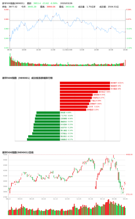 3月26日,新华500指数(989001)收盘报3953.40点,跌0.59%,成交额2504.51亿元;鱼跃医疗,复星医药,华大基因领涨。
