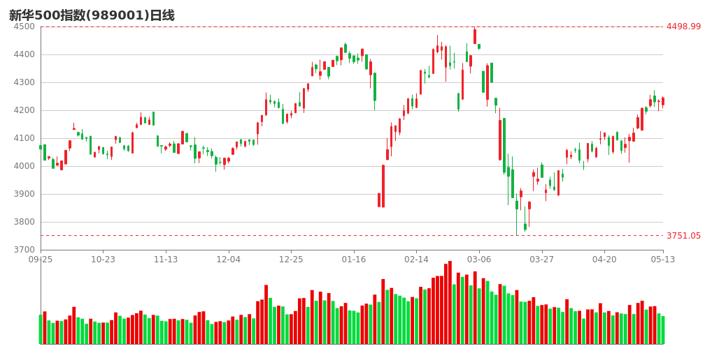 5月13日,新华500指数(989001)收盘报4244.62点,涨0.27%,成交额2147.06亿元;沙钢股份,南京新百,供销大集领涨。