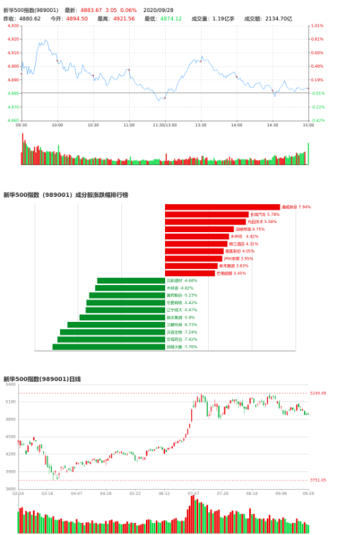 9月28日,新华500指数(989001)收盘报4883.67点,涨0.06%,成交额2134.70亿元;通威股份,长城汽车,光启技术领涨。
