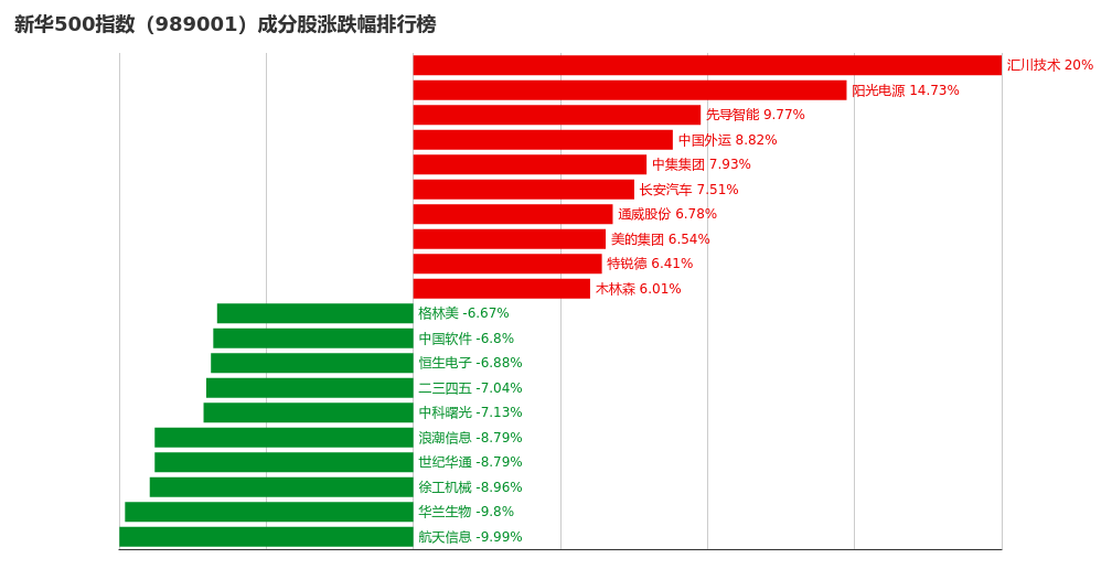 11月2日,新华500指数(989001)午盘报5022.18点,涨0.45%,成交额2193.14亿元;汇川技术,阳光电源,先导智能领涨。