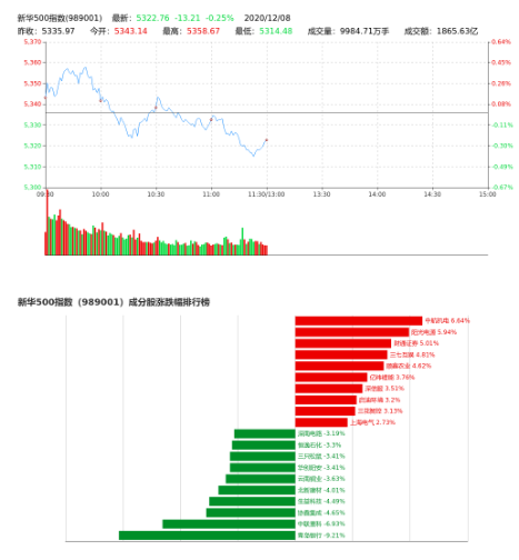 12月8日,新华500指数(989001)午盘报5322.76点,跌0.25%,成交额1865.63亿元;中航机电,阳光电源,财通证券领涨。