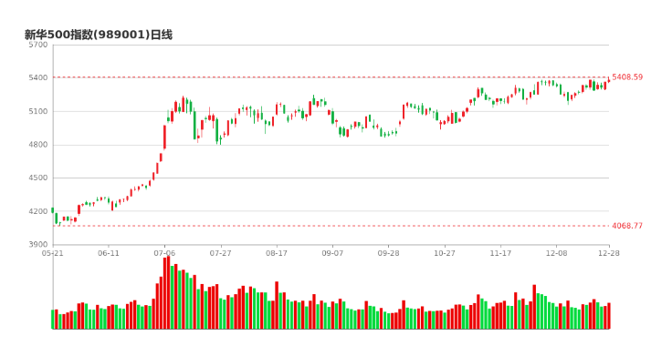 12月28日,新华500指数(989001)收盘报5381.61点,涨0.33%,成交额3815.45亿元;南山铝业,君正集团,上汽集团领涨。