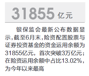 险资权益投资余额首次突破3万亿元大关。银保监会最新公布数据显示,截至6月末,险资配置股票与证券投资基金的资金运用余额为31855亿元,首次突破3万亿元;在险资运用余额中占比13.02%,为今年以来最高。