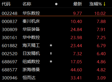 上证报中国证券网讯 10月19日上午交易时段,工业母机板块异动拉升。10时05分,华东数控涨停。秦川机床、华辰装备、华中数控上涨超7%。