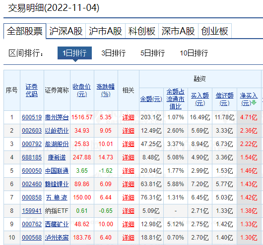 贵州茅台11月4日融资净买入额居前
