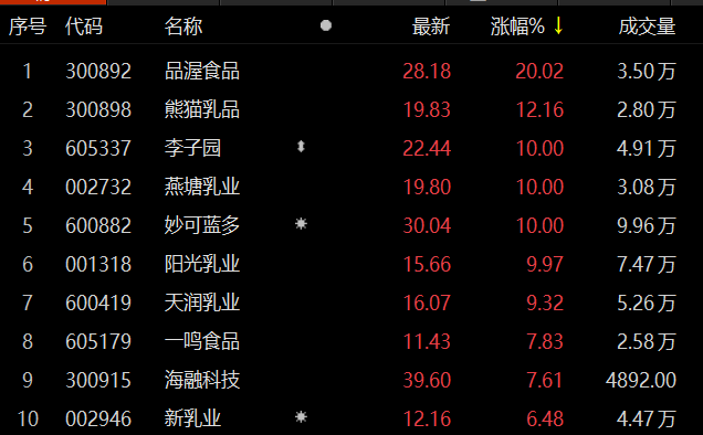上证报中国证券网讯 12月1日,乳业板块拉升,截至9:55,品渥食品、阳光乳业、妙可蓝多涨停,李子园触及涨停,熊猫乳品涨逾12%。