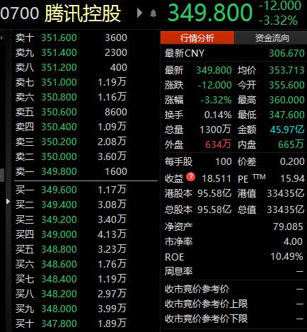腾讯控股盘中跌破350港元 为1月6日以来首次