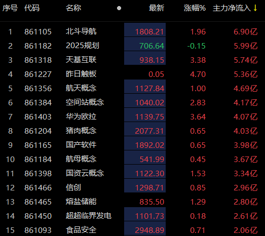 北斗导航、2025规划及天基互联主力资金净流入额居前