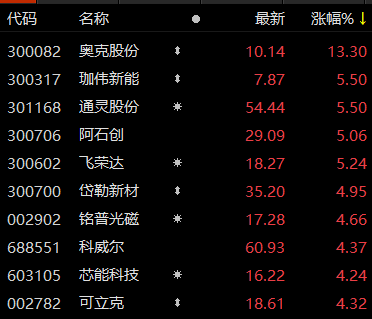 上证报中国证券网讯 3月29日,太阳能概念股开盘走强,9时52分,奥克股份涨超13%,珈伟新能、通灵股份、阿石创、飞荣达涨超5%。