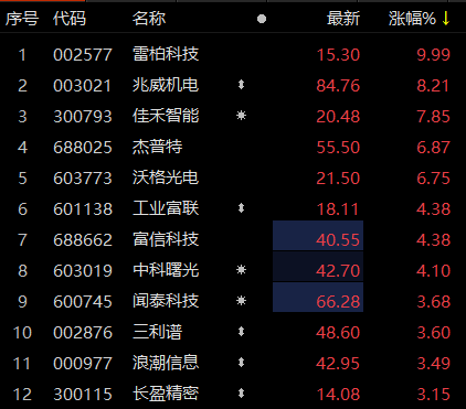 上证报中国证券网讯 4月12日早盘,电子板块高开。9时37分,雷柏科技一字涨停,兆威机电涨超8%,佳禾智能涨超7%,杰普特、沃格光电,工业富联等跟涨。