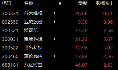 上证报中国证券网讯 4月12日午后交易时段,光刻胶概念股拉升。14时23分,苏大维格大涨近11%,亚威股份此前已涨停,爱司凯涨超7%,宝通科技、世名科技等涨幅居前。
