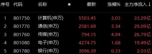 5大行业板块主力资金净流入额超2亿元 计算机板块居首