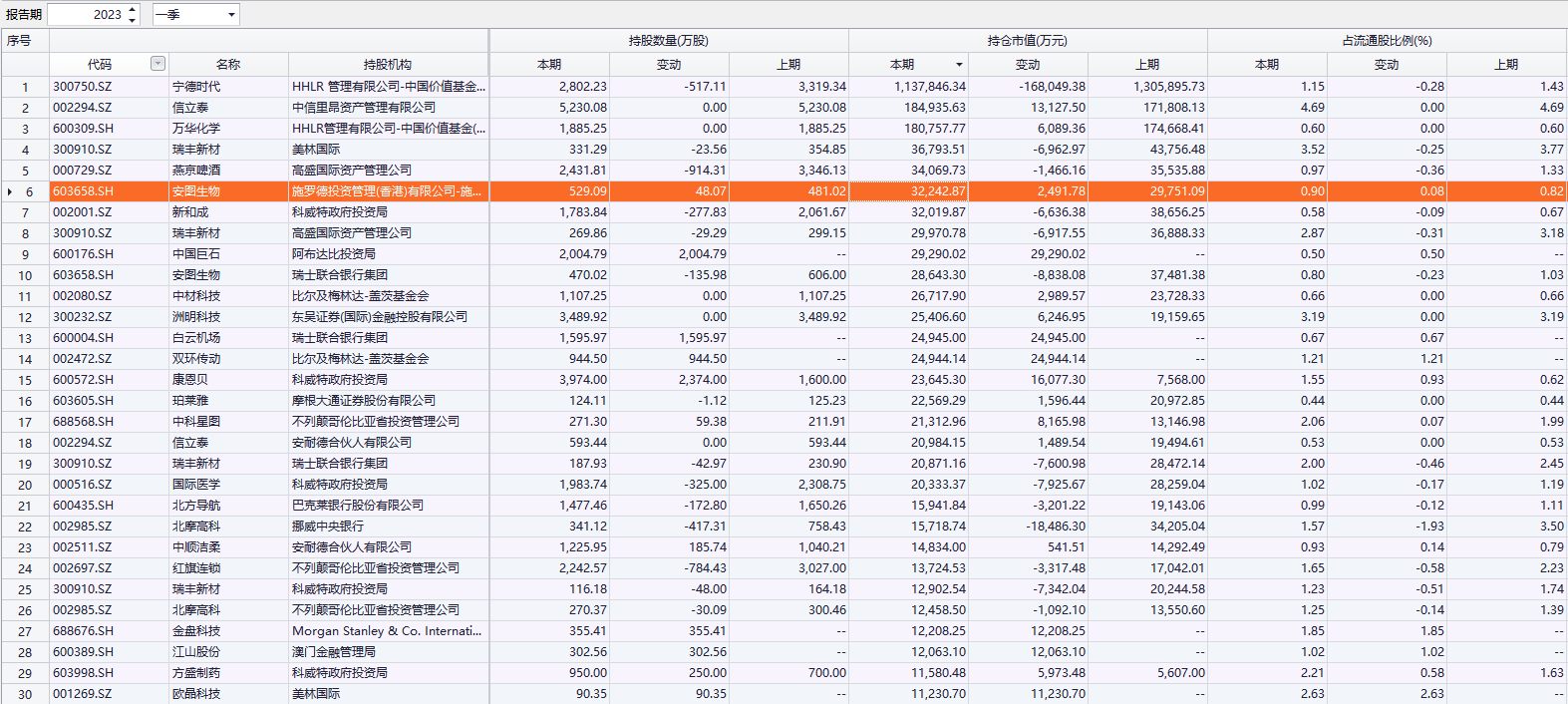 上证报中国证券网讯 随着A股2023年一季报陆续披露,QFII持仓动向逐渐浮出水面。Choice数据显示,截至4月21日收盘,在已披露2023年一季报的409家上市公司中,有74家公司前十大流通股股东名单中出现QFII身影;以2023年一季度末收盘价计算,合计持股市值225.74亿元,其中,持有宁德时代113.78亿元,持有信立泰、万华化学、瑞丰新材、燕京啤酒分别18.49亿元、18.08亿元、3.68亿元、3.41亿元。