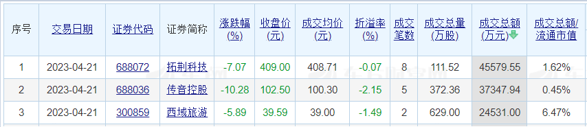 上证报中国证券网讯 据东方财富Choice数据,4月21日两市共60只个股发生大宗交易,总成交22.77亿元,其中拓荆科技、传音控股、西域旅游成交额居前,成交额依次为4.56亿元、3.73亿元、2.45亿元。