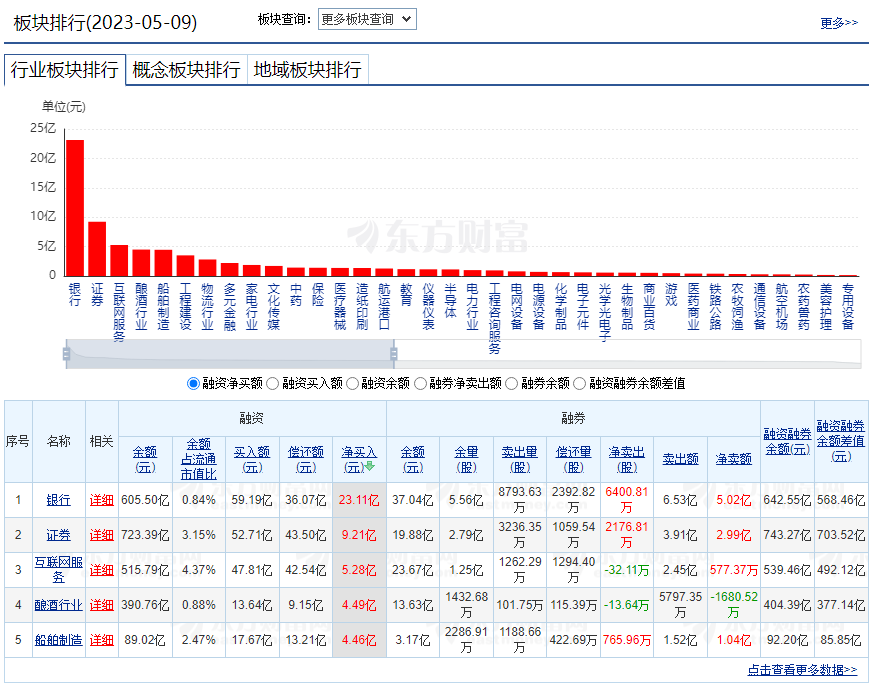 上证报中国证券网讯 据东方财富Choice数据,5月9日,在行业板块中,银行、证券及互联网服务的融资净买入额位居前三。其中,银行板块的净买入额超过23亿元。