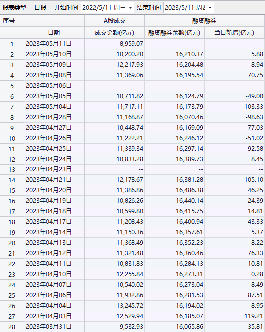 上证报中国证券网讯 Choice数据统计,5月11日,A股成交金额8959.07亿元,自4月以来首次不足万亿,连续24个交易日成交金额超万亿元纪录终结。