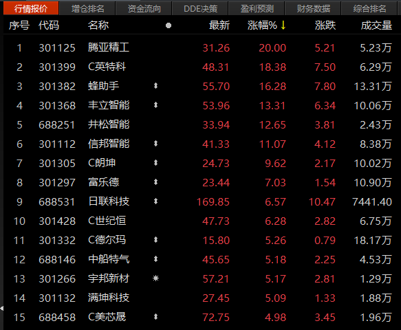 上证报中国证券网讯 Choice数据显示,5月24日早盘,次新股冲高。C英科特一度涨超20%,腾亚精工20CM涨停,丰立智能、蜂助手、井松智能等涨超10%。其中,丰立智能近五个交易日涨超130%。