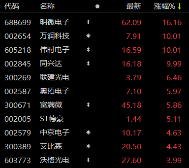 上证报中国证券网讯 6月7日午后交易时段,MiniLED板块拉升。13时13分,万润科技、伟时电子、同兴达涨停,明微电子涨超16%,联建光电、奥拓电子等纷纷冲高。