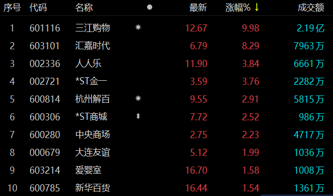 零售股盘中走强 三江购物涨停