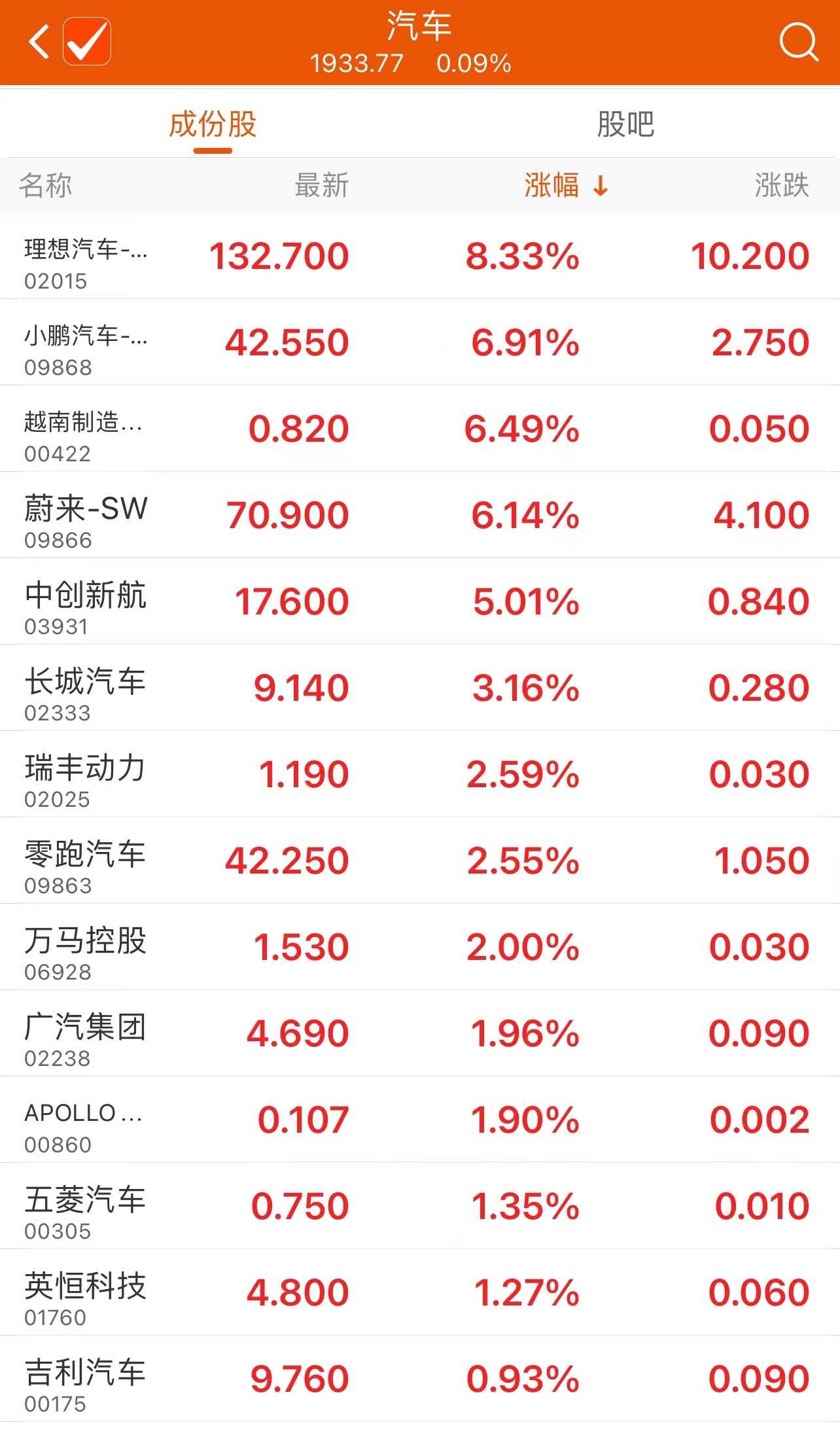 上证报中国证券网讯 6月14日上午交易时段,港股汽车股涨幅持续扩大。11时05分,理想汽车涨超8%、小鹏汽车涨近7%、蔚来-SW涨超6%。