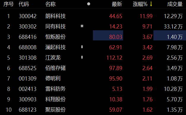存储芯片板块走高 朗科科技涨近12%