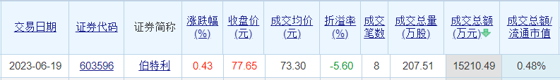 伯特利昨日大宗交易折价成交207.51万股 成交额1.52亿元