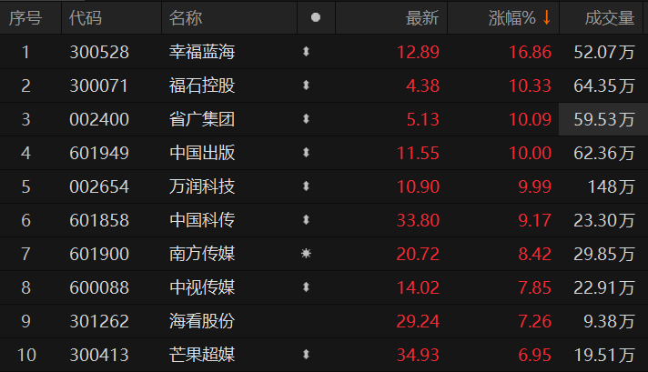 上证报中国证券网讯 7月13日,传媒板块午后持续走强,截至13:56,省广集团、中国出版、万润科技涨停,福石控股、幸福蓝海涨超10%,南方传媒、中视传媒等涨超7%。