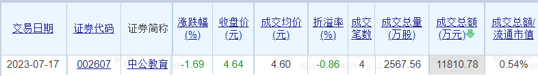 中公教育昨日大宗交易折价成交2567.56万股 成交额1.18亿元
