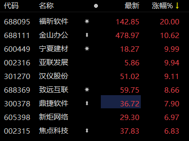 上证报中国证券网讯 7月19日开盘,人工智能概念股表现活跃。9时32分,福昕软件20CM涨停,金山办公涨超10%,宁夏建材涨停。