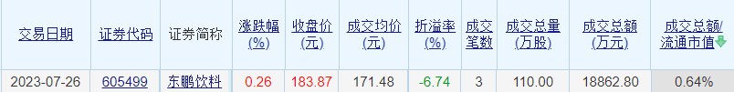 东鹏饮料昨日大宗交易折价成交1.89亿元 折价率6.74%