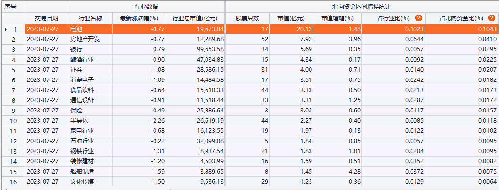 昨日北向资金净买入37.47亿元 电池、房地产开发、银行为加仓前三行业
