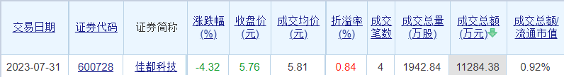 佳都科技昨日溢价成交1.13亿元大宗交易