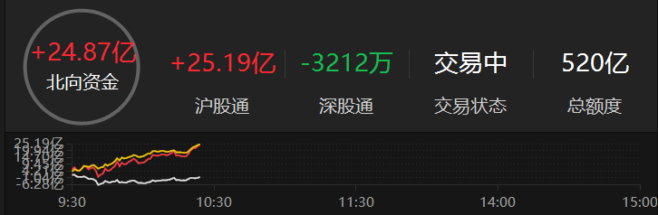 上证报中国证券网讯 截至8月1日10时25分,北向资金净流入超20亿元。其中,沪股通渠道净流入25.19亿元,深股通渠道净流出3212万元。