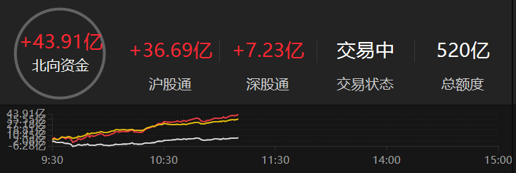 上证报中国证券网讯 截至8月1日11时12分,北向资金净流入超40亿元,达43.91亿元。其中,沪股通渠道净流入36.69亿元,深股通渠道净流入7.23亿元。