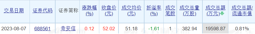 奇安信-U昨日大宗交易成交1.96亿元 折价率1.61%